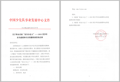 为贯彻党的十八大精神和习近平总书记系列重要讲话精神,落实团中央、全国少工委的有关要求,努力围绕少先队组织根本任务,积极探索新形势下服务青少年健康成长的路径和载体,进一步推进“中国青少年防灾减灾素质提升计划”,为青少年快乐、安全成长保驾护航,切实强化青少年安全意识、普及安全知识,提升防灾减灾技能,提高自救自护能力,中国少先队事业发展中心决定举办首届“安全小达人”--- 2015青少年安全素质和生存技能特训营,有关事宜如下: