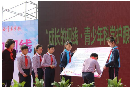 少先队代表在“成长的视线•青少年科学护眼”倡议书上签名