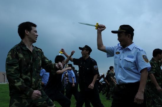5月29日上午,在广东省深圳市龙岗区中小学生社会实践基地,宽阔的操场上,一个蒙面歹徒手持利刃刺向了一个“学生”,身边一位青年保安猛扑过来把歹徒推开。寒光一闪,歹徒掉头持刀向保安刺来,保安巧妙地躲过了歹徒的一击,并顺手一招制敌将歹徒按在地上。