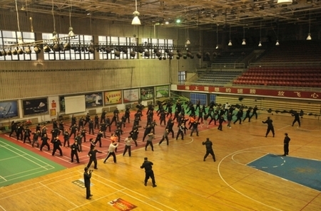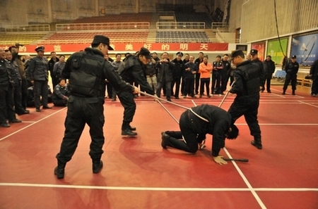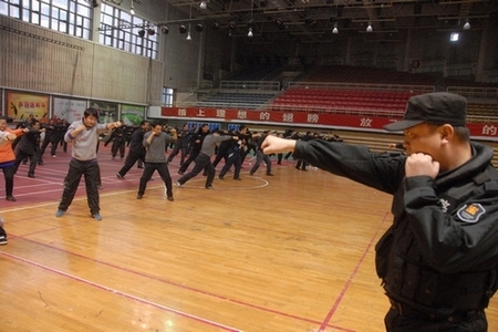 “哈!哈!嘿!嘿!”只见几个蒙面歹徒手持利刃向几个身穿保安服装的小伙子刺来,一阵刀光闪过,结果确是几个歹徒应声倒下。上百名身穿保安服装的人员热烈鼓掌。原来,这是河北省张家口宣化区正在进行校园安全防范培训。
