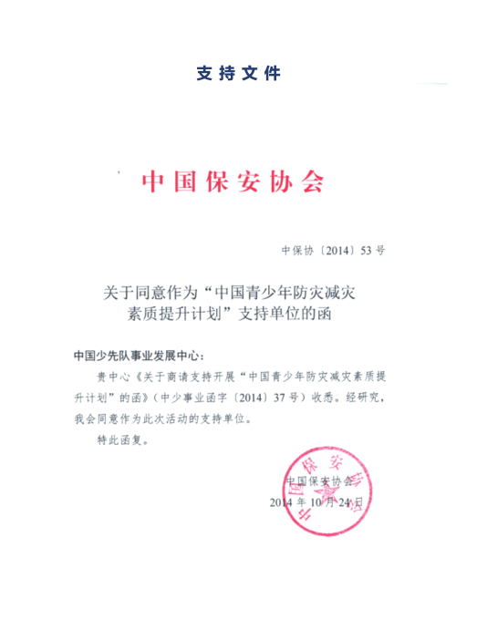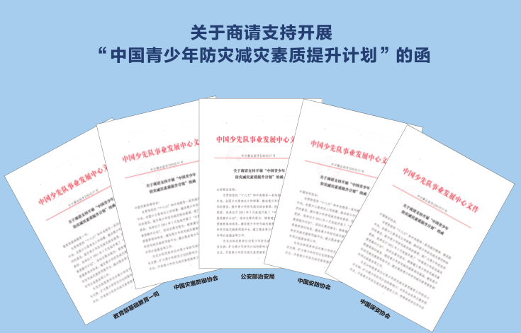 为贯彻党中央、国务院关于加强防灾减灾工作的决策部署,落实《国家综合防灾减灾规划(2011-2015年)》和第六次全国少代会有关精神,提高广大青少年防灾减灾意识和技能,中国少先队事业发展中心启动了“中国青少年防灾减灾素质提升计划”。该计划启动以来得到了教育部基础教育一司、公安部治安局、中国保安协会、中国灾害防御协会、中国安防协会等有关机构和部门的大力支持。